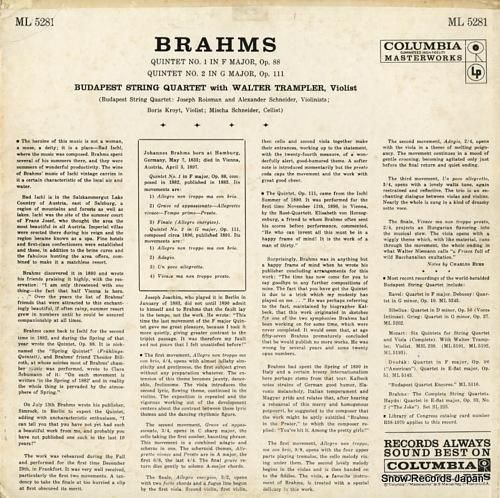 ブダペスト弦楽四重奏団 brahms; quintet no.1 / no.2 ML5281ML5281