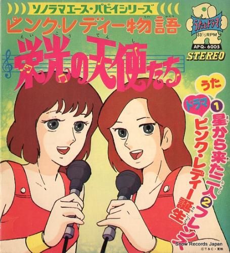 コメントピクチャー・スリーブ付、ブックレット付、朝日ソノラマ、ソノラマエース・パピイシリーズ、ピンク・レディー物語・栄光の天使たち、フレンズ、阿久悠、B面:ドラマ:ピンク・レディー誕生、見開きジャケ、ソノシート、ジャケにシミ、盤面に傷