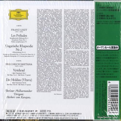 コメント帯付、インサート付、カラヤン指揮、ベルリン・フィルハーモニー管弦楽団によるリストとスメタナの交響詩集。ドイツ・グラモフォン・ヴィンテージ・コレクション。交響詩「前奏曲」、ハンガリー狂詩曲第2番、交響詩「高い城」、「モルダウ」、紙ジャケ